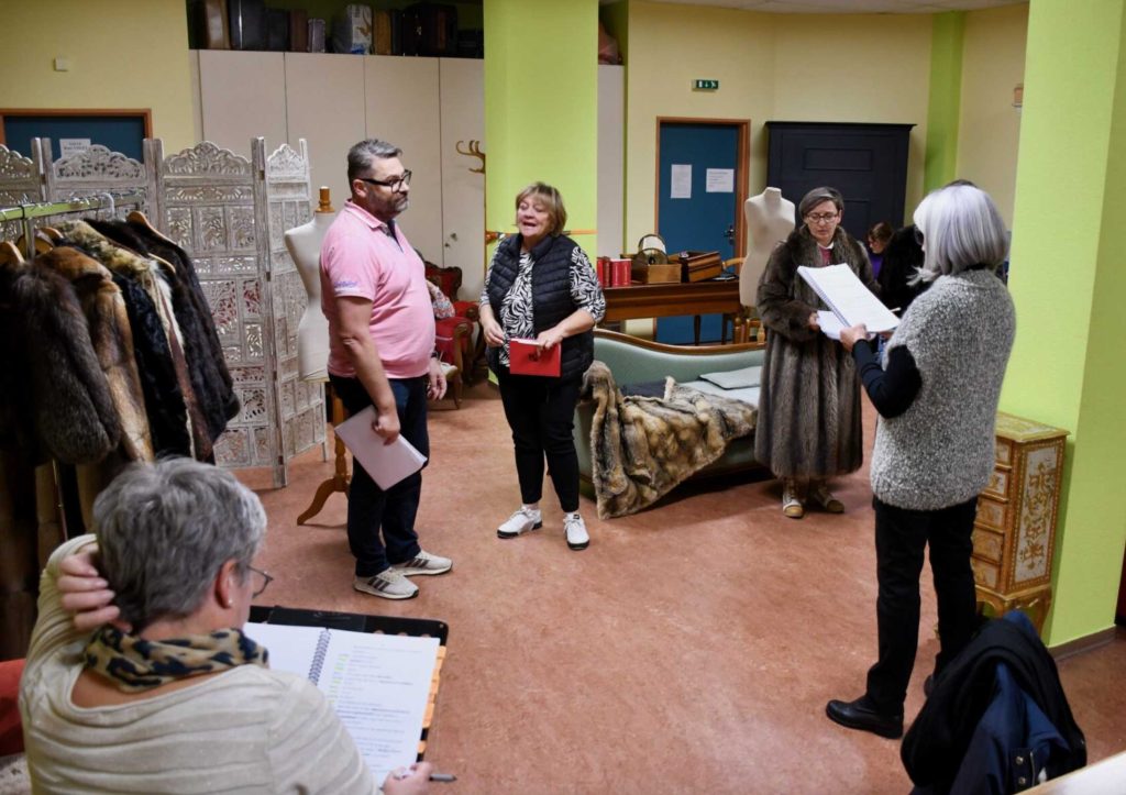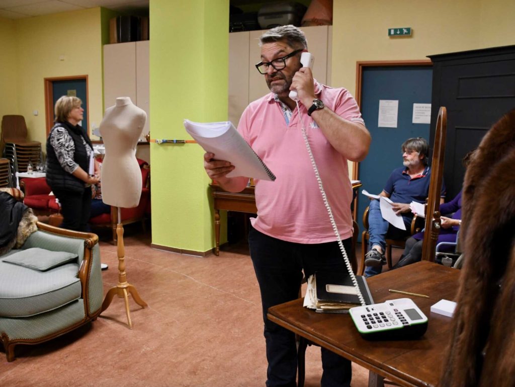 Après cet accueil, les choses sérieuses commencent. Au centre de la pièce trône un canapé vert, et de chaque côté, se dressent deux portants garnis de manteaux. Ce soir de novembre 2025, les acteurs répètent la pièce “Net glich Schatzala”, une comédie mettant en scène des fabricants de manteaux de fourrure. Et les situations rocambolesques ne manquent pas…